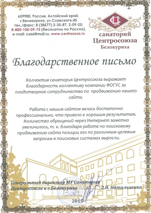 Коллектив санатория Центросоюза выражает благодарность коллективу компании ФОГУС за плодотворное сотрудничество по продвижению нашего сайта